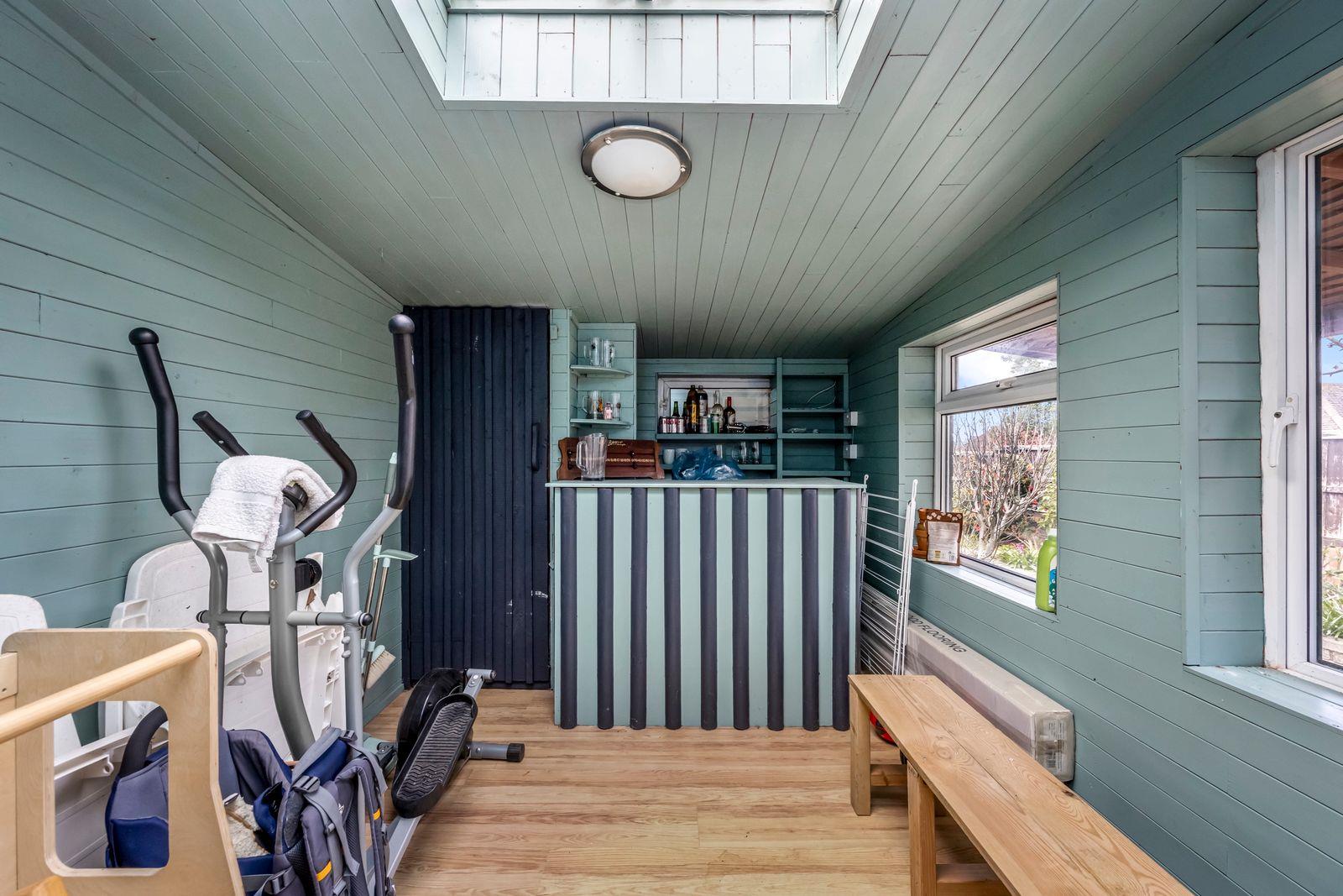 In terms of outside space, the property has off street parking to the front, a shared driveway and a good sized south facing rear garden. There is a useful outbuilding (formerly the garage) and a workshop positioned behind. The garden enjoys a fabulous southerly aspect and view.