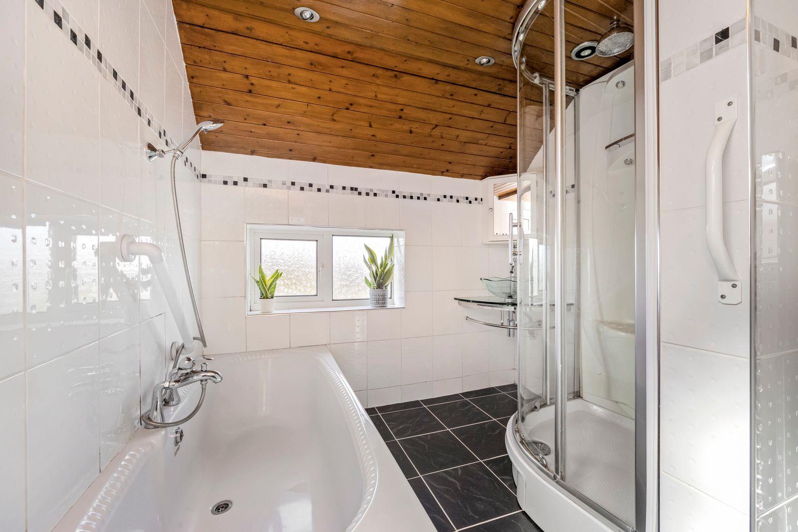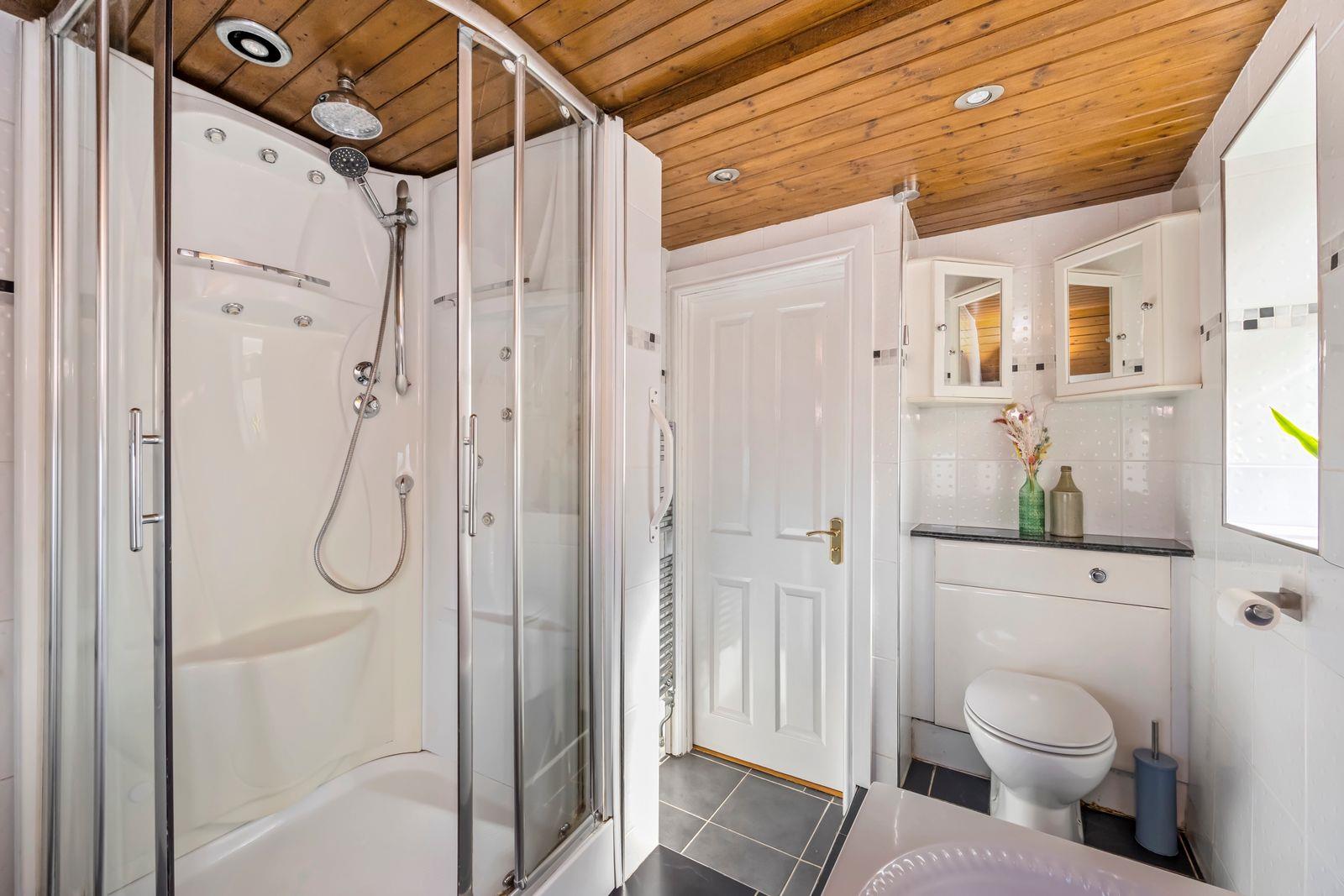 - A BATHROOM WITH A WHITE SUITE WITH BATH AND SHOWER ENCLOSURE